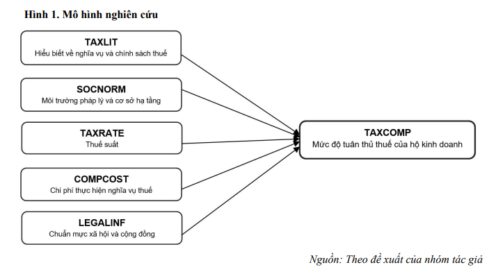 Dựa trên cơ sở lý luận về tuân thủ thuế và tổng quan các nghiên cứu trước, nghiên cứu này đề xuất mô hình nghiên cứu nhằm phân tích các nhân tố ảnh hưởng đến mức độ tuân thủ thuế của hộ kinh doanh (TAXCOMP). Cụ thể, mô hình nghiên cứu giả định mức độ tuân thủ thuế của hộ kinh doanh chịu tác động trực tiếp của năm biến độc lập tương ứng với 5 giả thuyết đã đặt ra như Hình 1, bao gồm: (i) Hiểu biết về nghĩa vụ và chính sách thuế (TAXLIT), phản ánh mức độ nhận thức và năng lực tuân thủ của người nộp thuế; (ii) Môi trường pháp lý và cơ sở hạ tầng thông tin thuế (SOCNORM), thể hiện mức độ minh bạch, thuận lợi và hỗ trợ từ hệ thống quản lý thuế; (iii) Thuế suất (TAXRATE), đại diện cho gánh nặng thuế và yếu tố kinh tế tác động đến quyết định tuân thủ; (iv) Chi phí thực hiện nghĩa vụ thuế (COMPCOST), phản ánh chi phí thời gian, tài chính và thủ tục mà hộ kinh doanh phải bỏ ra để tuân thủ; và (v) Chuẩn mực xã hội và cộng đồng (LEGALINF), thể hiện áp lực xã hội, đạo đức thuế và ảnh hưởng từ môi trường xung quanh. Các biến được đo lường bằng thang đo Likert 5 mức, từ 1 - “Hoàn toàn không đồng ý” đến 5 - “Hoàn toàn đồng ý”. Mỗi nhân tố được đo bằng nhiều biến quan sát được kế thừa và điều chỉnh từ các nghiên cứu quốc tế và trong nước theo kết quả từ nghiên cứu định tính.