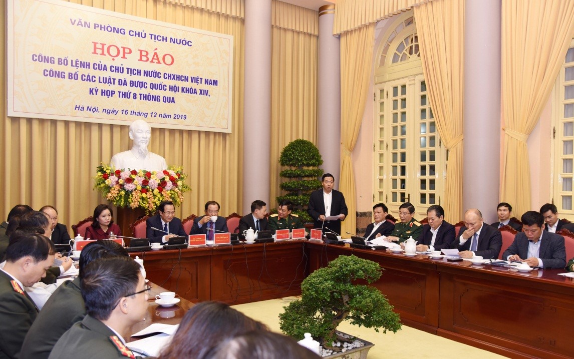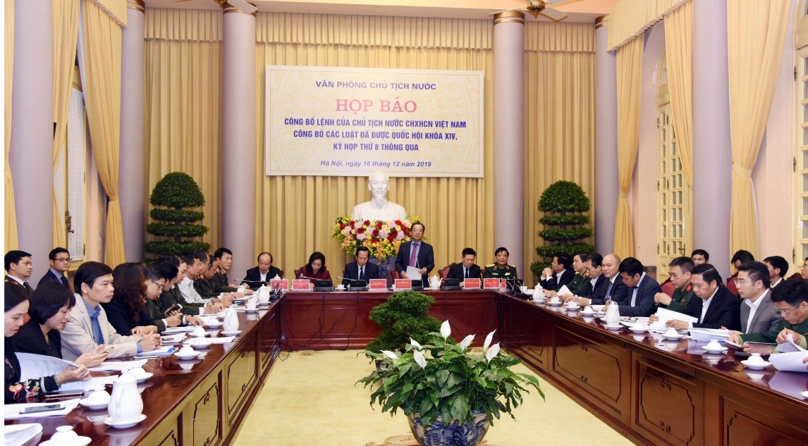 Quang cảnh Họp báo Tham dự Họp báo có các đồng chí: Ủy viên Trung ương Đảng, Chủ nhiệm Văn phòng Chủ tịch nước Đào Việt Trung; Ủy viên Trung ương Đảng, Tổng Kiểm toán Nhà nước Hồ Đức Phớc; Ủy viên Trung ương Đảng, Bộ trưởng Bộ Lao động-Thương binh và Xã hội Đào Ngọc Dung; đại diện lãnh đạo các Bộ, ngành, cơ quan có liên quan đến các Luật được công bố và đại diện các cơ quan thông tấn báo chí.