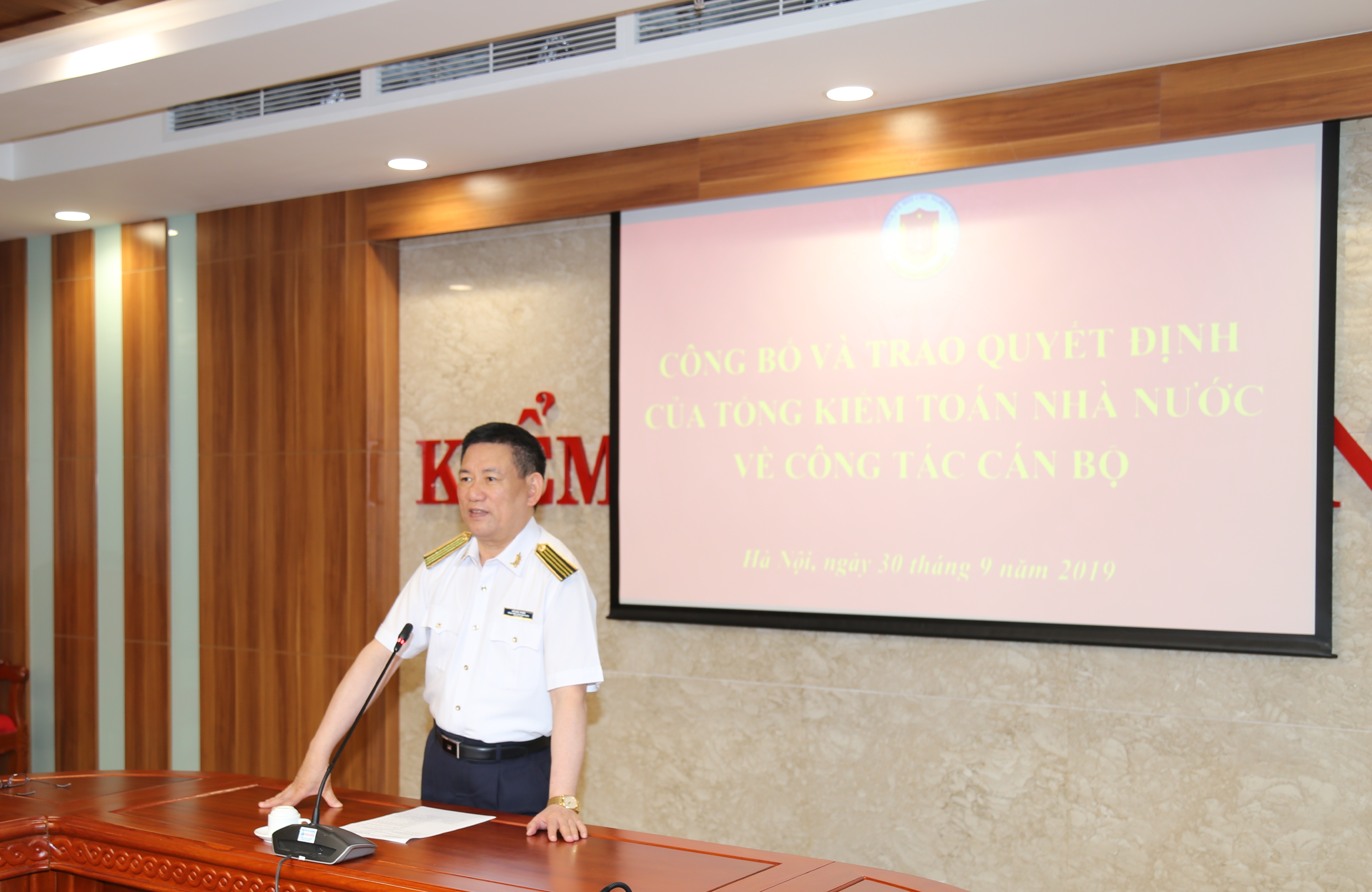 (khoahockiemtoan.vn) - Ngày 30/9/2019, tại trụ sở 116, Nguyễn Chánh, Hà Nội, Kiểm toán nhà nước (KTNN) tổ chức công bố trao Quyết định nghỉ hưu hưởng chế độ bảo hiểm xã hội đối với PGS.TS Nguyễn Đình Hòa, Q.Giám đốc Trường ĐT&BD nghiệp vụ kiểm toán(Trường) và công bố Quyết định điều động bổ nhiệm ông Lê Minh Nam - Phó Kiểm toán trưởng KTNN chuyên ngành VI về làm Giám đốc Trường ĐT&BD nghiệp vụ kiểm toán. Đến dự, buổi Lễ công bố có TS. Hồ Đức Phớc, Ủy viên Trung ương Đảng, Tổng KTNN, GS.TS Đoàn Xuân Tiên, Phó Tổng KTNN, đại diện Lãnh đạo cấp vụ các đơn vị trực thuộc KTNN và toàn thể cán bộ viên chức, người lao động của Trường.