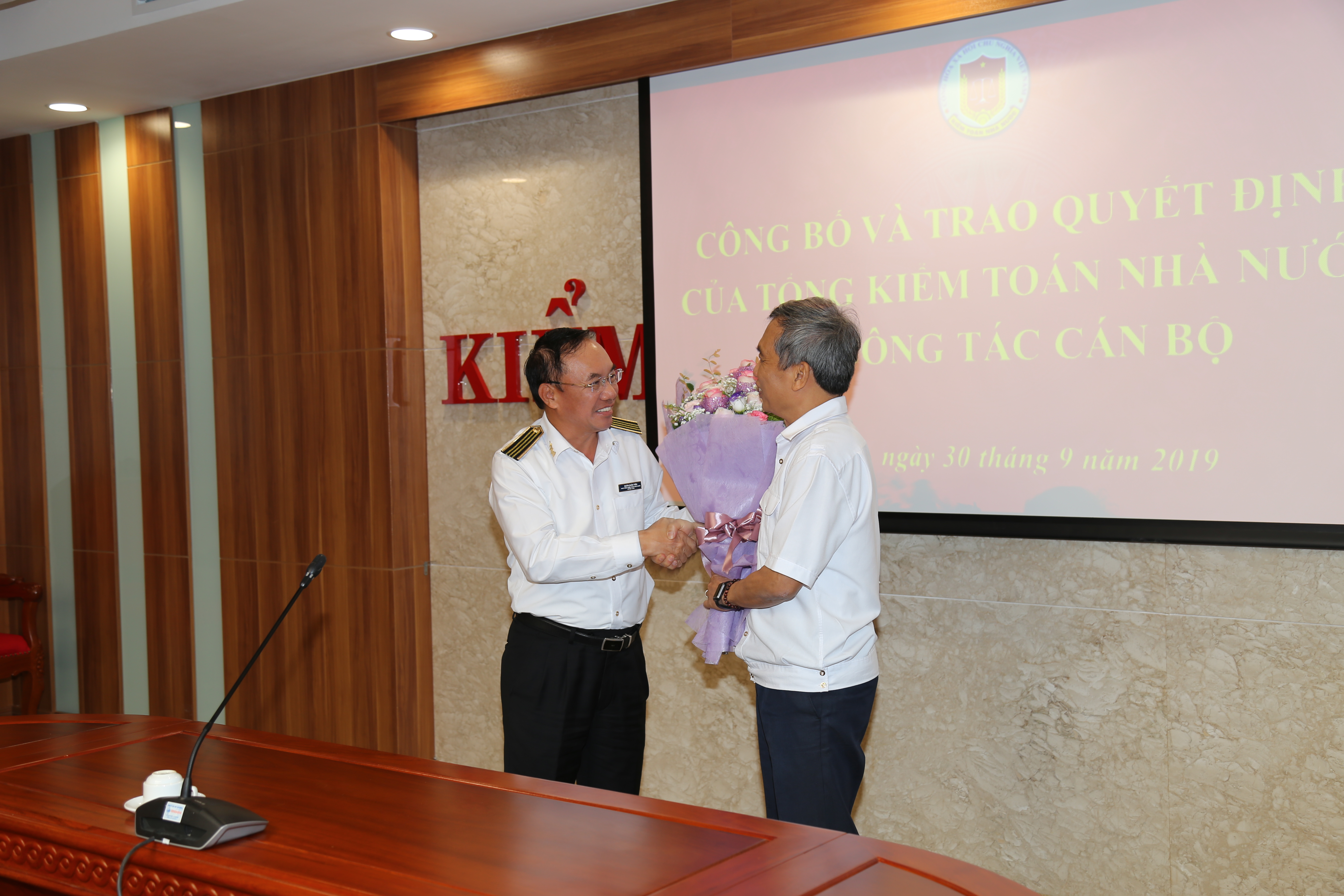 GS.TS Đoàn Xuân Tiên, Phó Tổng KTNN tặng hoa cho PGS.TS Nguyễn Đình Hòa Tại buổi Lễ, ông Nguyễn Mạnh Cường - Phó Vụ trưởng Vụ Tổ chức Cán bộ đã công bố Quyết định số Số 1646/QĐ-KTNN, ngày 30/9/2019 của Tổng KTNN về việc điều động bổ nhiệm ông Lê Minh Nam - Phó Kiểm toán trưởng KTNN chuyên ngành VI về giữ chức vụ Giám đốc Trường ĐT&BD nghiệp vụ kiểm toán kể từ ngày 01/10/2019, ông Lê Minh Nam được hưởng phụ cấp chức vụ 1,0, thời hạn bổ nhiệm 5 năm, kể từ ngày 01/10/2019.
