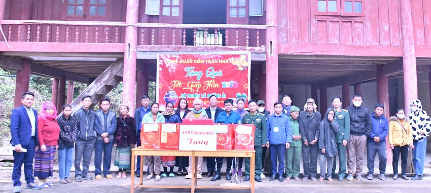 Đoàn công tác của Công đoàn KTNN trao quà Tết cho 20 hộ nghèo và UBND xã Mường Ải. Ảnh: Thùy Anh