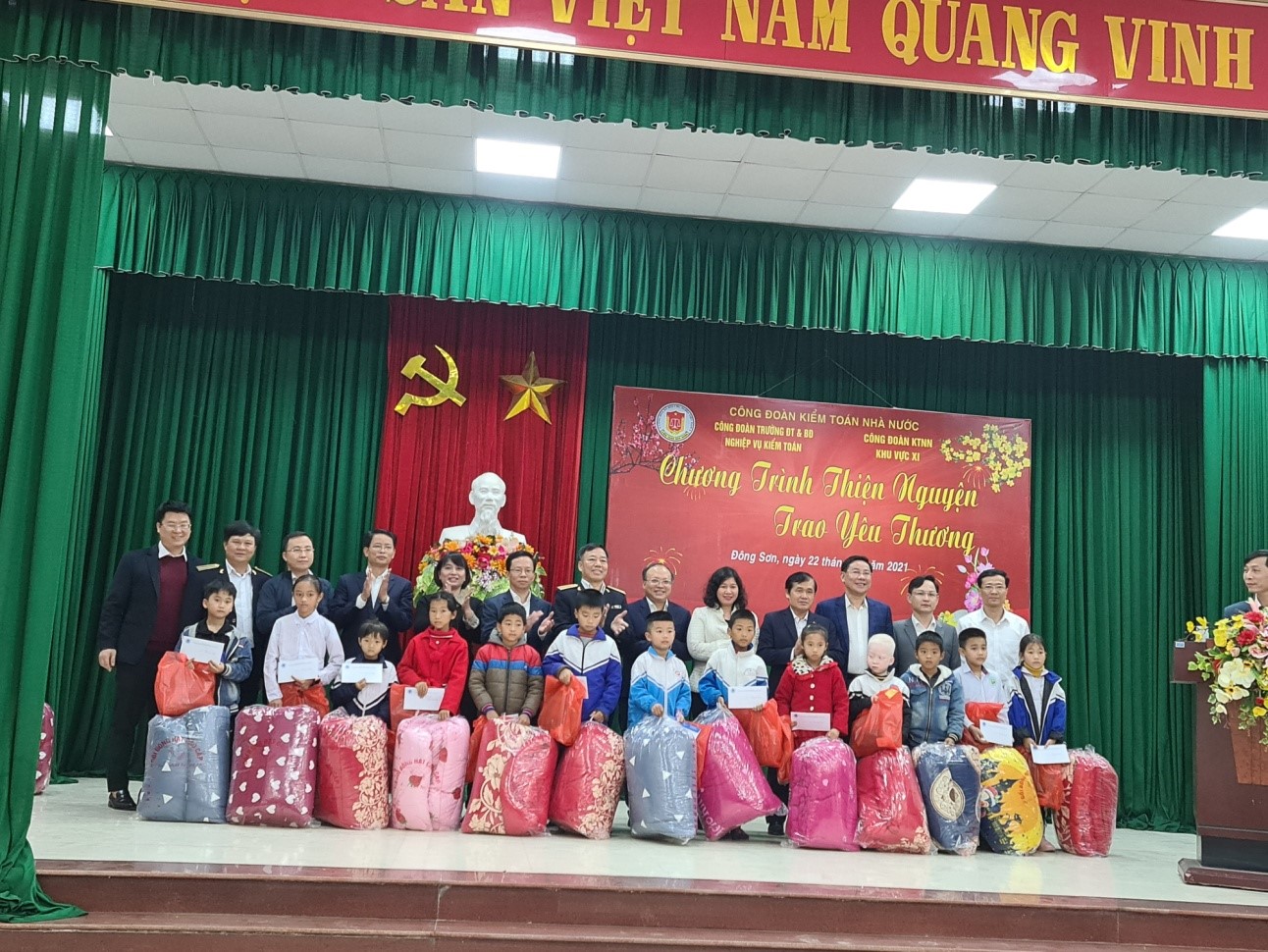 Chiều cùng ngày, tại UBND huyện Đông Sơn, tỉnh Thanh Hóa, Công đoàn Trường phối hợp với Công đoàn KTNN khu vực XI trao tặng 60 xuất quà, gồm: 500 ngàn đồng tiền mặt, chăn ấm, khăn, mũ len…cho các em học sinh nghèo vượt khó có thành tích cao trong học tập.