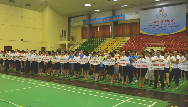 (khoahockiemtoan.vn) - Ngày 29/6, tại Nhà thi đấu quận Cầu Giấy (Hà Nội), Công đoàn KTNN đã tổ chức Giải thể thao chào mừng kỷ niệm 25 năm Ngày thành lập KTNN (11/7/1994- 11/7/2019). Đến dự buổi Lễ khai mạc Hội thao có Phó Tổng KTNN Đặng Thế Vinh, bà Phan Thị Phương Hạnh, Phó Chủ tịch Công Đoàn Viên chức Việt, đại diện Lãnh đạo các đơn vị trong Ngành cùng gần 300 vận động viên tham dự.