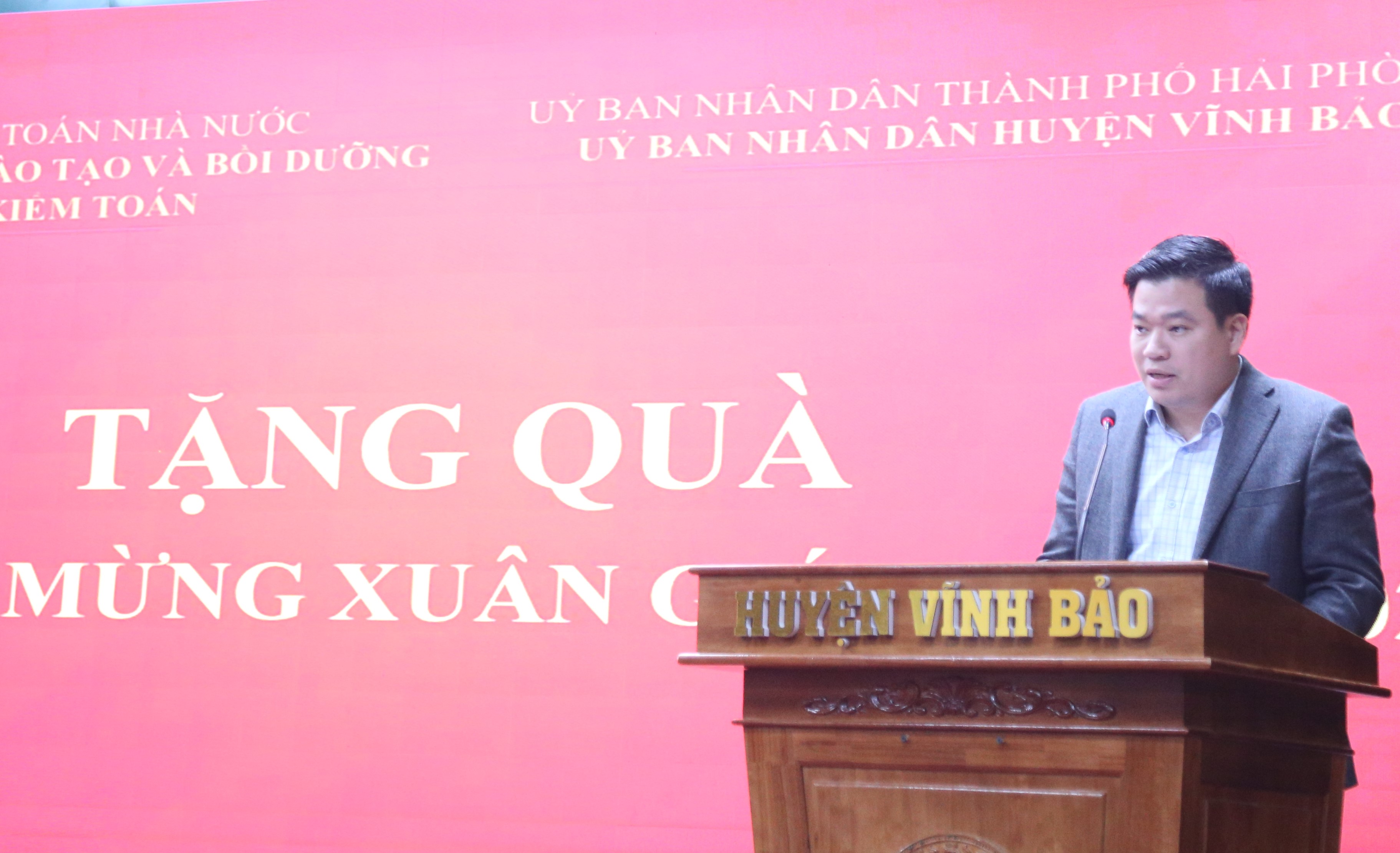 Thay mặt UBND huyện Vĩnh Bảo, ông Lê Ngọc Lân - Phó Chủ tịch UBND huyện đã chân thành cảm ơn sự quan tâm của Lãnh đạo, Công đoàn Trường ĐT&BD Nghiệp vụ kiểm toán với các hộ nghèo trên địa bàn, những tình cảm này phần nào giúp các hộ được đón Xuân mới  ấm áp, tươi vui hơn.
