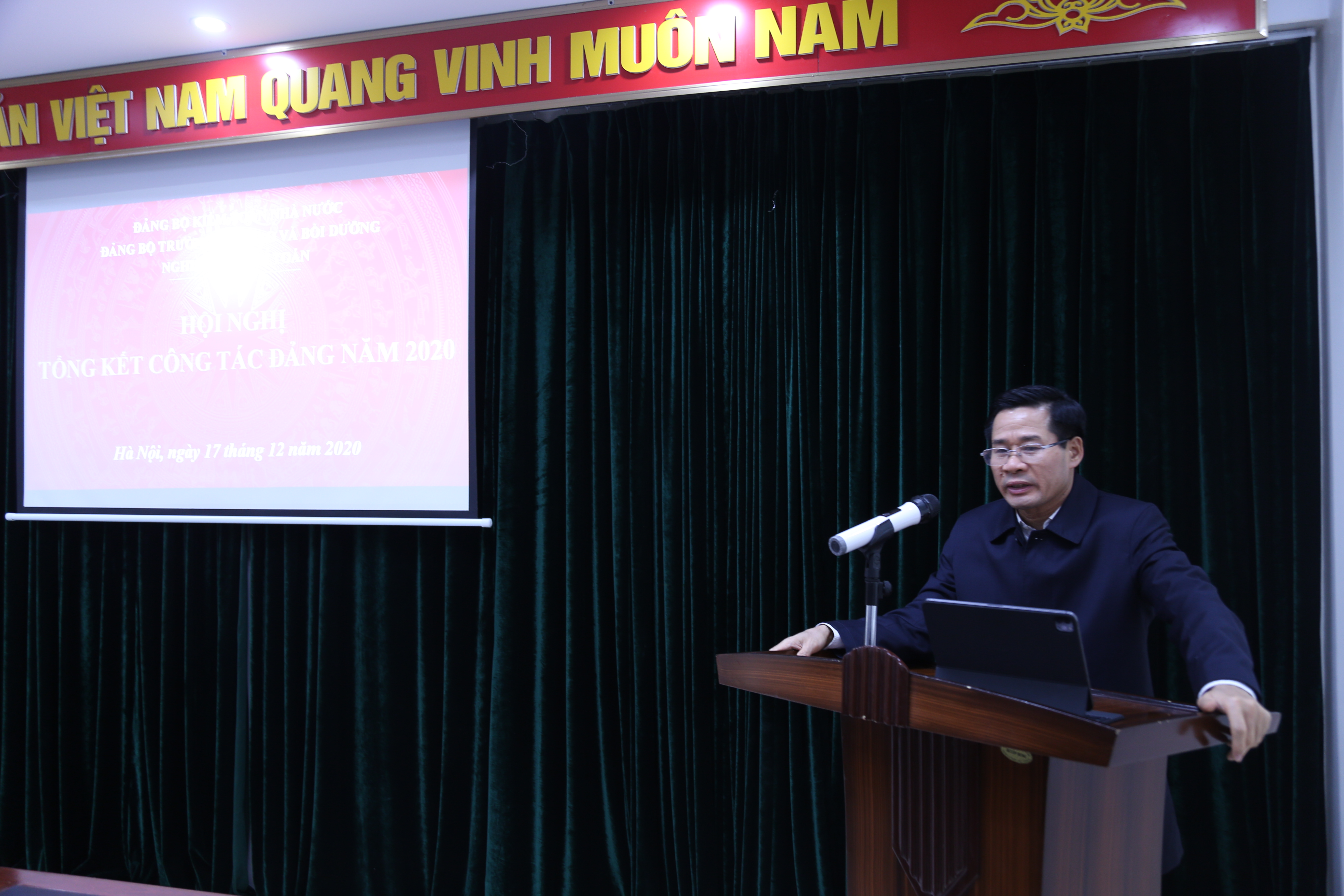 Toàn cảnh Hội nghị Trong năm 2020, công tác giáo dục chính trị tư tưởng luôn được Đảng bộ Trường quan tâm. Đảng bộ đã phổ biến và tổ chức triển khai thực hiện tới toàn đảng viên những văn bản nghị quyết: Chỉ thị 1043-CT/BTV ngày 13/01/2020 của Ban Thường vụ Đảng ủy KTNN về thực hiện thắng lợi nhiệm vụ chính trị trọng tâm năm 2020; Ban hành Kế hoạch số 04/KH-ĐB ngày 22/02/202 của Đảng bộ Trường triển khai, thực hiện Chỉ thị của Ban Thường vụ Đảng ủy về thực hiện thắng lợi nhiệm vụ chính trị năm 2020; Triển khai thực hiện Nghị quyết Đại hội Đảng bộ Trường lần thứ VI và một số Nghị quyết, quyết định quan trọng khác của Đảng ủy Trường; tổ chức quán triệt cho đảng viên nắm bắt chương trình hành động và tham gia học tập các Nghị quyết của BCH TƯ khóa XII do Đảng ủy KTNN tổ chức.
