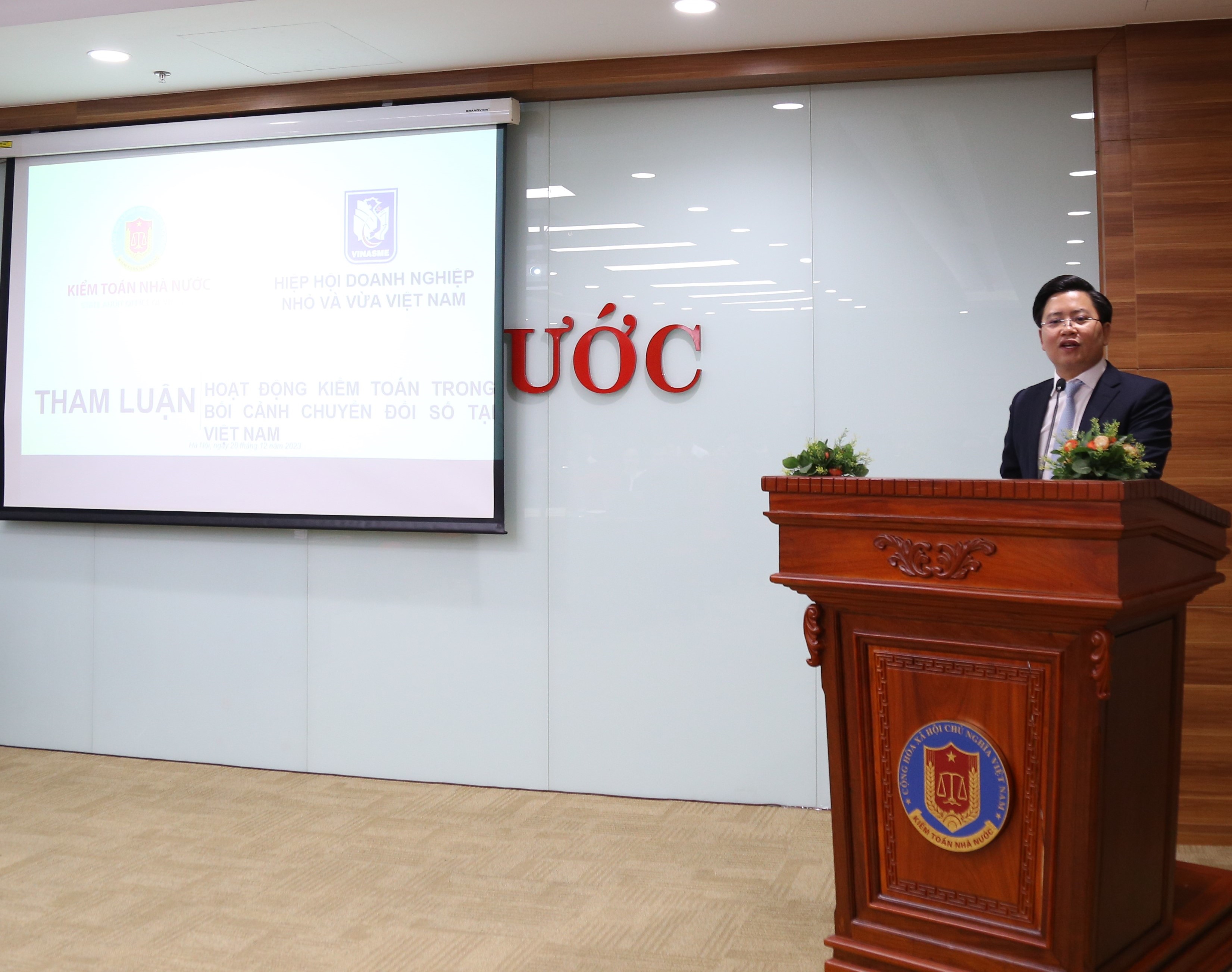 (khoahockiemtoan.vn) - Thực hiện Quyết định số 701/QĐ-KTNN này 16/5/2023 của Tổng KTNN về việc tổ chức Hội thảo cấp bộ, sáng ngày 28/12/2023, Trường ĐT&BD nghiệp vụ kiểm toán, KTNN chuyên ngành VII, Vụ hợp tác quốc tế phối hợp tổ chức Hội thảo “Giải pháp đẩy mạnh ứng dụng công nghệ thông tin phục vụ hoạt động kiểm toán trong bối cảnh chuyển đổi số tại Việt Nam”, đến dự Hội thảo có đại diện Bảo hiểm Xã hội Việt Nam, Ủy ban Quản lý vốn nhà nước, Hiệp hội Kế toán Công chứng Anh(ACCA), Hiệp hội Doanh nghiệp nhỏ và vừa Việt Nam, Ngân hàng Nhà nước Việt Nam, Công ty kiểm toán KPMG, E&Y, PWC…; đại diện lãnh đạo, cùng công chức, viên chức các đơn vị trực thuộc KTNN.