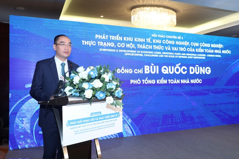 Phó Tổng Kiểm toán nhà nước Bùi Quốc Dũng phát biểu khai mạc Hội thảo Dự Hội thảo còn có sự tham gia của nhiều chuyên gia, nhà khoa học từ các tổ chức, trường đại học, học viện trong nước và quốc tế. Đại diện các cơ quan quản lý nhà nước Bộ Tài chính, Bộ Kế Hoạch Đầu tư, Bộ Xây dựng, Bộ Tài nguyên và Môi trường, Bộ Giao Thông - Vận tải, đại diện các hiệp hội; đại diện các Công ty kiểm toán, lãnh đạo đại diện các tập đoàn, Tổng công ty hoạt động trong lĩnh vực đầu tư phát triển Khu kinh tế - Khu công nghiệp, các Doanh nghiệp đang hoạt động tại các khu công nghiệp và đại diện các đại sứ quán Lào, Inđônêxia, Thụy Điển, Malaysia. Hội thảo do Phó Tổng Kiểm toán nhà nước Bùi Quốc Dũng và Thứ trưởng Bộ Kế hoạch và Đầu tư Nguyễn Thị Bích Ngọc đồng chủ trì.