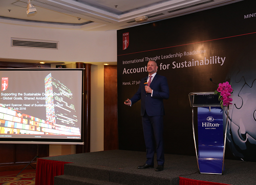 PGS.TS Đặng Thái Hùng - Vụ trưởng Vụ Chế độ Kế toán và Kiểm toán, đại diện Bộ Tài chính, đánh giá cao những nỗ lực và đóng góp đáng kể của ICAEW cho sự phát triển của ngành kế toán kiểm toán ở Việt Nam nói riêng và cho mục tiêu phát triển của cộng đồng các nước khu vực Đông Nam Á nói chung. “Các mục tiêu toàn cầu về phát triển bền vững mà chúng ta đã thảo luận ngày hôm nay, đặc biệt trong bối cảnh của Việt Nam hiện tại, là không thể trì hoãn. Cái tên Formosa đến giờ này, mỗi người Việt Nam đều biết. Điều thiết thực nhất mà chúng ta có thể làm, từ các tổ chức quốc tế cho đến mỗi quốc gia, mỗi doanh nghiệp, đó là cần phải dành những nguồn lực riêng và ngân sách riêng cho mục tiêu phát triển bền vững. Đối với những người hành nghề kế toán, báo cáo tài chính cần phải trung thực, chính xác, minh bạch, rõ ràng, phải chứng minh và phân tích được các tác động đến phát triển bền vững. Về phía Nhà nước, cần nhanh chóng áp dụng các quy định, hướng dẫn về vấn đề này dựa trên các chuẩn mực và nền tảng quốc tế, cũng như có những hướng dẫn cụ thể để có thể dẫn đến những hành động thiết thực. Và chúng ta chỉ có một cách duy nhất là cùng nhau hướng về phía trước để giải quyết các yếu kém tồn đọng.”