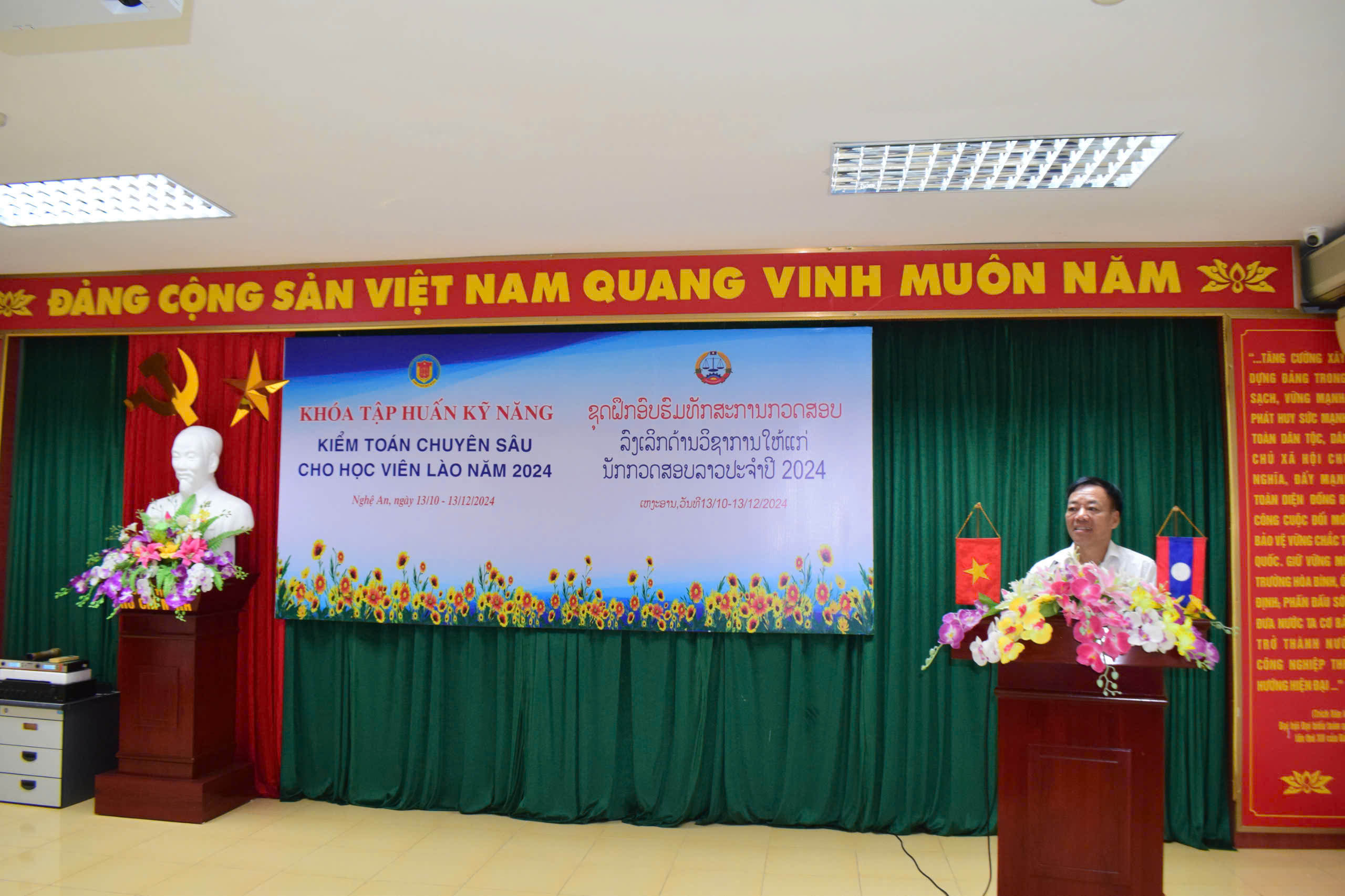 Phát biểu khai giảng khóa đào tạo, Ông Trần Kim Lộc, Giám đốc Trường Đào tạo và Bồi dưỡng nghiệp vụ kiểm toán, cho biết việc tổ chức khóa bồi dưỡng tại Nghệ An không chỉ là dịp để các học viên Lào nâng cao kiến thức và kỹ năng chuyên môn, mà còn là cơ hội để chia sẻ kinh nghiệm, học hỏi từ các giảng viên giàu kinh nghiệm của Kiểm toán nhà nước Việt Nam. “Chúng tôi tin rằng khóa học này sẽ trang bị cho các học viên những kỹ năng kiểm toán hiện đại, giúp các đồng chí hoàn thành tốt nhiệm vụ trong tương lai.”, ông Trần Kim Lộc cho biết. Ông tin tưởng rằng khóa bồi dưỡng là một cơ hội quý báu để các kiểm toán viên Kiểm toán nhà nước Lào nâng cao kỹ năng, tích lũy kinh nghiệm thực tiễn trong lĩnh vực kiểm toán đồng thời hy vọng với sự hướng dẫn tận tình của các giảng viên và sự hỗ trợ từ đội ngũ tổ chức của Kiểm toán nhà nước Việt Nam, các kiểm toán viên nước bạn sẽ học tập thật hiệu quả, lĩnh hội được nhiều kiến thức bổ ích và vận dụng vào thực tiễn công việc một cách linh hoạt. “Sau khóa học, chúng tôi tin rằng các đồng chí sẽ tự tin và sẵn sàng áp dụng những kiến thức tiếp thu được để góp phần phát triển kiểm toán nhà nước Lào.”