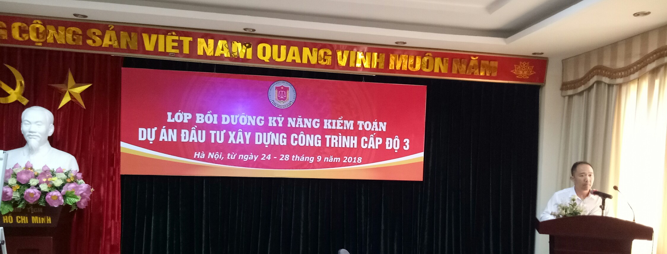 (khoahockiemtoan.vn) - Sáng ngày 24/9/2018, Trường ĐT&BD nghiệp vụ kiểm toán (Trường) đã tổ chức khai giảng Lớp Bồi dưỡng kiểm toán dự án đầu tư xây dựng công trình cấp độ 3.  Dự buổi lễ khai giảng có Ông Trần Minh Khương - Kiểm toán trưởng KTNN khu vực XII, ông Nguyễn Anh Phương - Trưởng phòng Quản lý đào tạo và bồi dưỡng và các học viên theo Quyết định triệu tập.