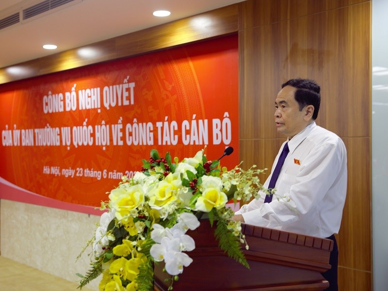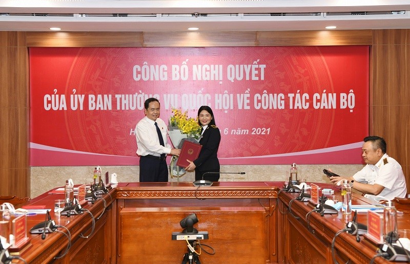 Ủy viên Bộ Chính trị, Phó Chủ tịch Thường trực Quốc hội Trần Thanh Mẫn trao Nghị quyết cho tân Phó Tổng KTNN Hà Thị Mỹ Dung