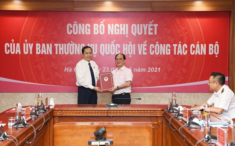 Ủy viên Bộ Chính trị, Phó Chủ tịch Thường trực Quốc hội Trần Thanh Mẫn trao Nghị quyết cho Phó Tổng KTNN Nguyễn Quang Thành