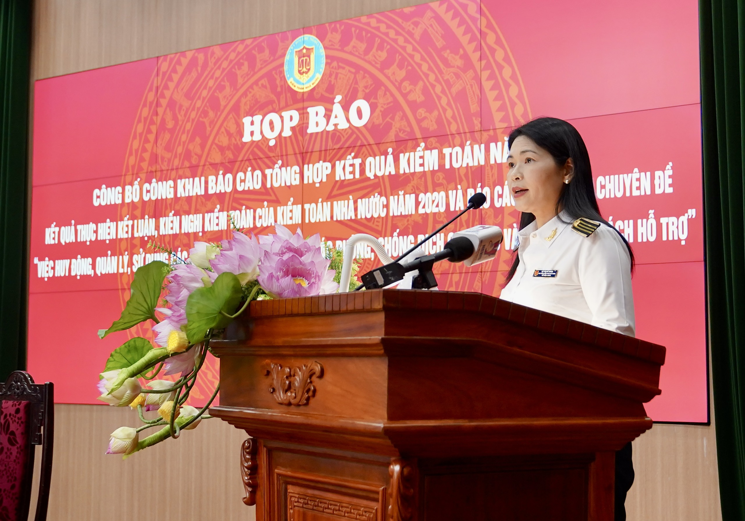 Phát biểu khai mạc, Phó Tổng Kiểm toán nhà nước Hà Thị Mỹ Dung cho biết, tại cuộc họp báo, KTNN tổ chức công khai kết quả kiểm toán đối với 02 nội dung: Báo cáo cáo tổng hợp kết quả kiểm toán năm 2021, kết quả thực hiện kết luận, kiến nghị kiểm toán năm 2020 của KTNN và Báo cáo kiểm toán chuyên đề “Việc huy động, quản lý, sử dụng các nguồn lực phục vụ công tác phòng, chống dịch Covid -19 và các chính sách hỗ trợ”.