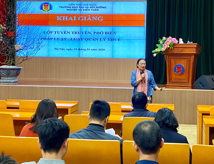 Toàn cảnh buổi tập huấn Khai giảng lớp tập huấn, Phó Giám đốc Trường Đào tạo và Bồi dưỡng nghiệp vụ kiểm toán Lăng Trịnh Mai Hương cho biết, Luật Quản lý Thuế số 38/2019/QH14 có hiệu lực thi hành từ 1/7/2020, riêng quy định về hóa đơn, chứng từ điện tử có liệu lực từ ngày 01/7/2022 là Luật quan trọng, có ảnh hưởng tới hoạt động của Ngành trong tương lai. Vì vậy, KTNN tổ chức lớp tuyên truyền, phổ biến pháp luật “Luật quản lý thuế” cung cấp các nội dung mới của Luật, nhằm hỗ trợ công tác kiểm toán. Phó Giám đốc Trường Đào tạo và Bồi dưỡng nghiệp vụ kiểm toán đề nghị các học viên tập trung, nghiêm túc tham dự lớp tập huấn, tích cực trao đổi với Báo cáo viên để làm rõ các nội dung được tập huấn, các kinh nghiệm thực tiễn công tác thuế nhằm nâng cao công tác chuyên môn kiểm toán thuế.