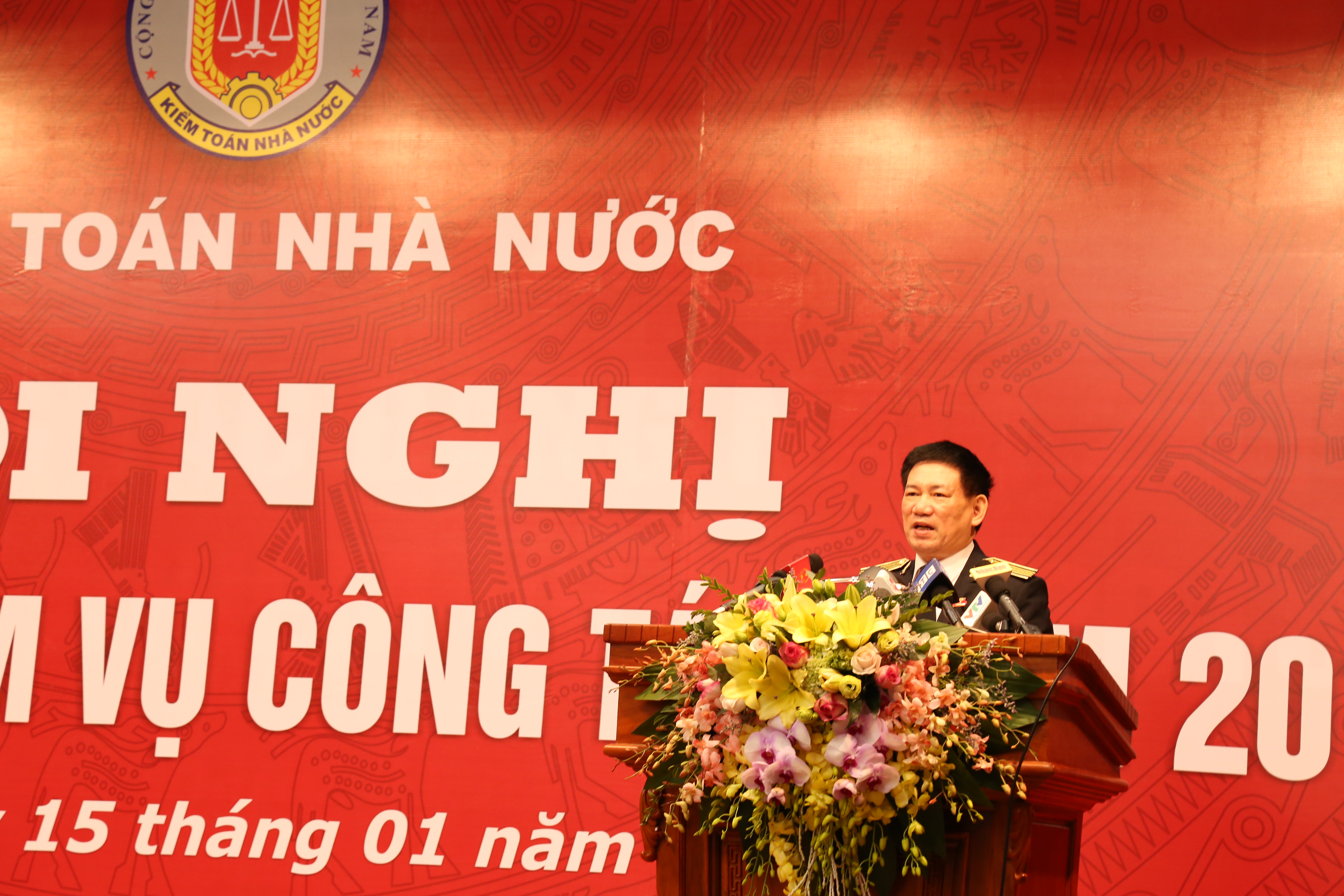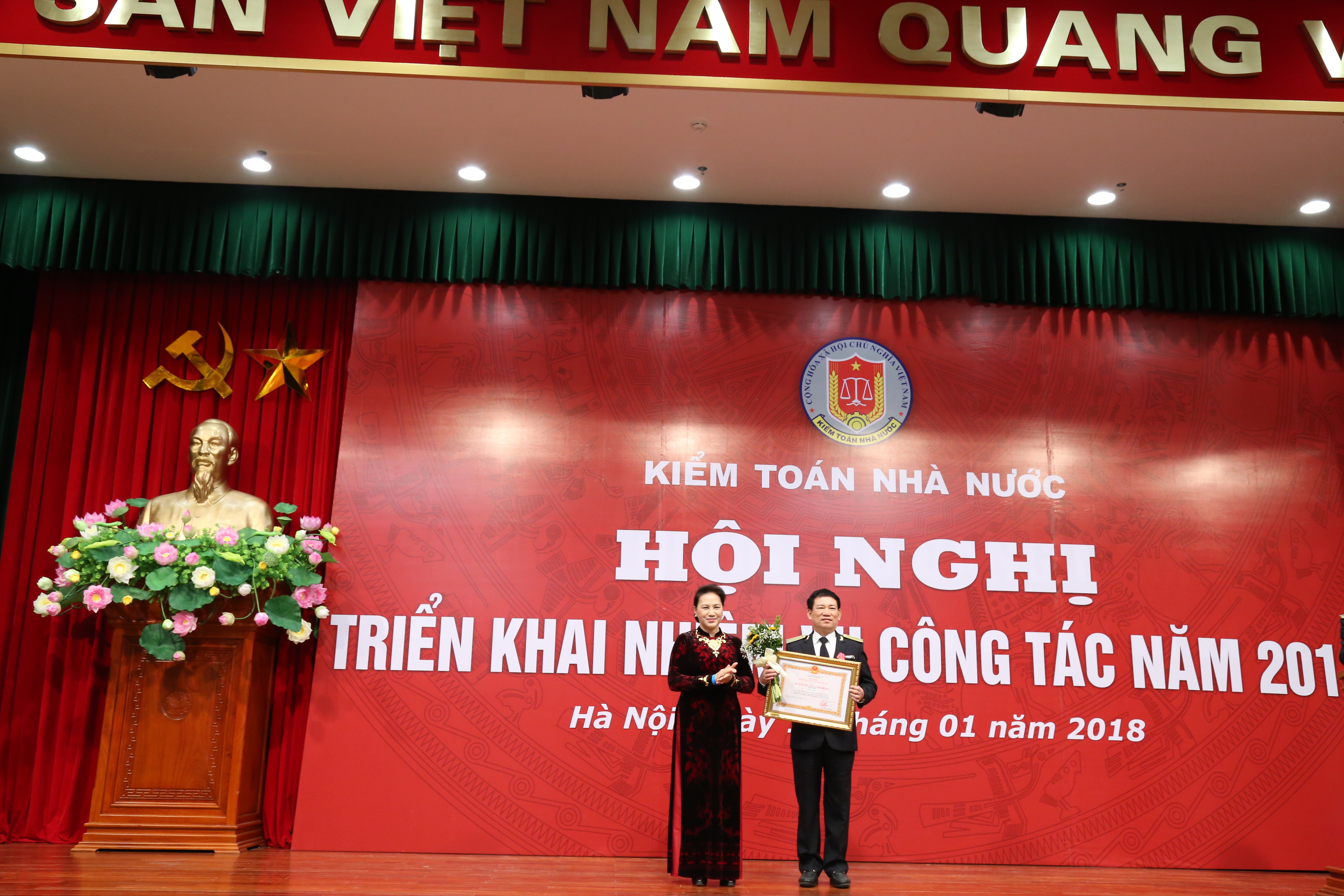(khoahockiemtoan.vn) - Sáng 15/01, tại trụ sở số 116 đường Nguyễn Chánh, quận Cầu Giấy, TP. Hà Nội, KTNN đã trang trọng tổ chức “Hội nghị triển khai nhiệm vụ công tác năm 2018”. Ủy viên Bộ Chính trị, Chủ tịch Quốc hội Nguyễn Thị Kim Ngân tới dự và phát biểu chỉ đạo Hội nghị. Dự Hội nghị có các đồng lãnh đạo đại diện các bộ, ngành Trung ương: Đồng chí Võ Văn Dũng - Ủy viên T.Ư Đảng, Phó Trưởng ban Nội chính T.Ư; Nguyễn Lâm Thành - Phó Chủ tịch Hội đồng dân tộc; Đinh Văn Nhã - Phó Chủ nhiệm Ủy ban Tài chính - Ngân sách; Phùng Đức Tiến - Phó Chủ nhiệm Ủy ban Khoa học Công nghệ & Môi trường; Nguyễn Thị Thúy Ngần - Phó Chủ nhiệm Văn phòng Quốc hội; Bùi Sỹ Lợi - Phó Chủ nhiệm Ủy ban các vấn đề Xã hội; Phạm Tất Thắng - Phó Chủ nhiệm Ủy ban Văn hóa Giáo dục Thanh thiếu niên và Nhi đồng; Nguyễn Đình Quyền - Viện trưởng Viện nghiên cứu Lập pháp; Bùi Đức Thụ - Phó Trưởng Ban công tác Đại biểu; Nguyễn Mai Bộ - Ủy viên thường trực Ủy ban Quốc phòng An ninh; Lê Minh Khái - Ủy viên T.Ư Đảng, Tổng Thanh tra Chính phủ; Nguyễn Xuân Thành - Phó Chủ nhiệm Văn phòng Chính phủ; Nguyễn Thế Phương - Thứ trưởng Bộ Kế hoạch & Đầu tư; Trần Xuân Hà - Thứ trưởng Bộ Tài chính; Phạm Công Tạc - Thứ trưởng Bộ Khoa học & Công nghệ; Nguyễn Minh Hồng - Thứ trưởng Bộ Thông tin & Truyền thông; Nguyễn Thế Hùng - Phó Chủ tịch UBND TP.Hà Nội; Nguyễn Thị Hồng - Phó Thống đốc Ngân hàng Nhà nước; Lưu Sỹ Quý - Cục trưởng Cục Tài chính, Bộ Quốc phòng.