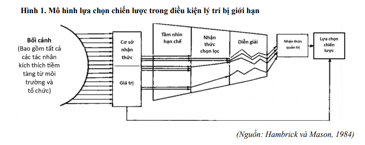 Hình 1 mô tả quá trình mà các đặc điểm của nhà quản trị cấp cao ảnh hưởng đến các quyết định chiến lược của doanh nghiệp. Mô hình của Hambrick và Mason (1984) cho thấy xuất phát điểm là bối cảnh (The Situation), nơi chứa đựng vô số các kích thích tiềm tàng từ môi trường và tổ chức. Tuy nhiên, các nhà quản trị không thể hấp thụ toàn bộ dữ liệu này. Thay vào đó, dựa trên Cơ sở nhận thức (Cognitive Base) và Hệ giá trị (Values) riêng biệt, họ trải qua một quá trình chọn lọc thông tin qua ba bộ lọc nghiêm ngặt. Trong quá trình này, đặc trưng Tầm nhìn hạn hẹp (Limited Field of Vision) nên nhà quản trị chỉ quan sát được một phần nhỏ của thực tại dựa trên sự quan tâm và định hướng cá nhân. Họ nhận thức có chọn lọc (Selective Perception) trong phạm vi tầm nhìn đó, họ chỉ thực sự tiếp nhận những tín hiệu phù hợp với niềm tin và kinh nghiệm sẵn có. Cuối cùng, những dữ liệu đã lọc được xử lý và gán cho ý nghĩa chủ quan thông qua Sự diễn giải (Interpretation). Kết quả của phễu lọc này tạo nên Nhận thức của nhà quản trị (Managerial Perceptions) và dẫn đến các Lựa chọn chiến lược (Strategic Choice), bao gồm cả việc quyết định có vận dụng các hệ thống kế toán quản trị phức tạp hay không. Mô hình này cũng hàm ý một vòng lặp phản hồi, nơi các giá trị cốt lõi liên tục tác động ngược trở lại để củng cố các lựa chọn trong tương lai.