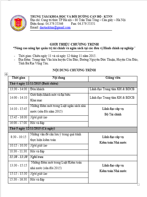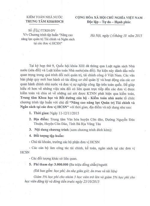 Để giúp hiểu rõ hơn về những sửa đổi có liên quan trực tiếp đến các đơn vị được kiểm toán và những chia sẻ về những sai sót được Kiểm toán nhà nước phát hiện qua kiểm toán, Trung tâm khoa học và bồi dưỡng cán bộ - Kiểm toán nhà nước tổ chức chương trình tập huấn với chủ đề “ Nâng cao năng lực Quản trị tài chính và Ngân sách tại các đơn vị HCSN” .
