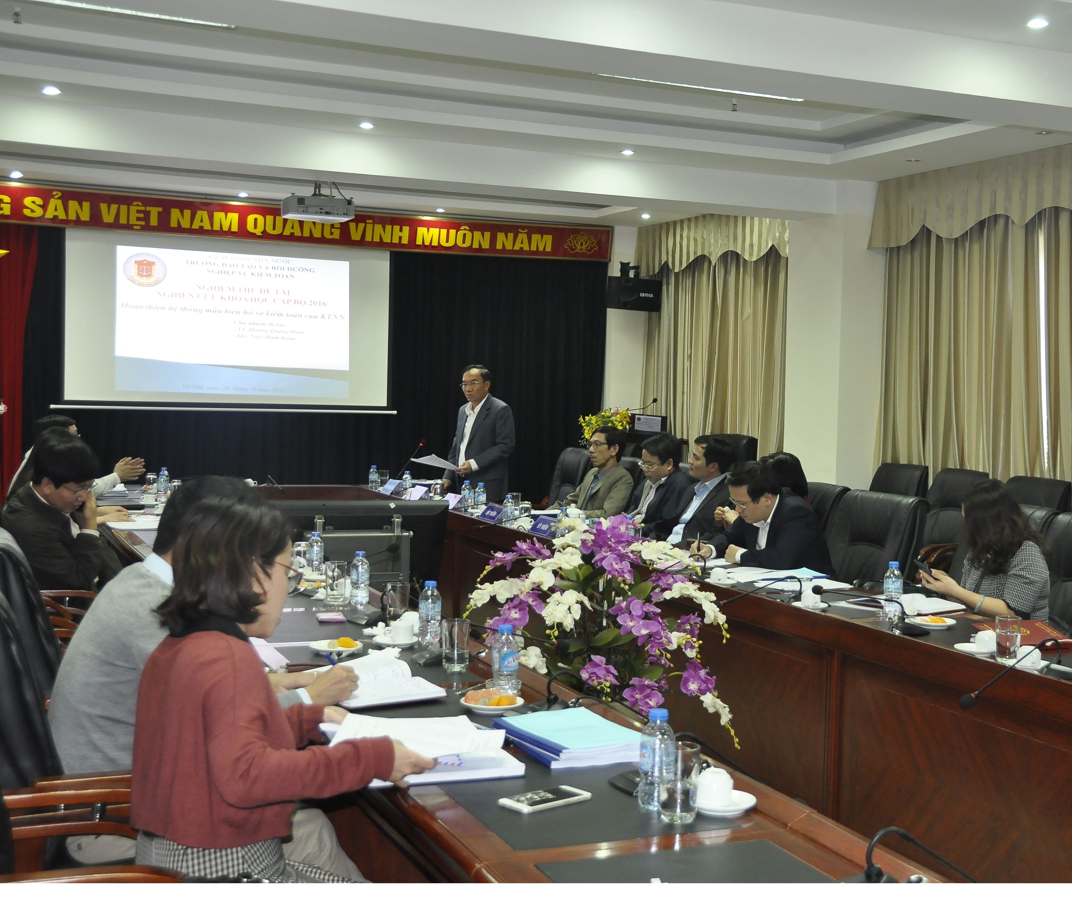 (khoahockiemtoan.vn) - Ngày 28/11/2017, tại trụ sở Kiểm toán nhà nước, Hội đồng khoa học KTNN đã tổ chức nghiệm thu đề tài nghiên cứu khoa học cấp Bộ: “Hoàn thiện hệ thống mẫu biểu hồ sơ kiểm toán của Kiểm toán nhà nước” do TS. Hoàng Quang Hàm và Ths. Ngô Minh Kiểm làm đồng chủ nhiệm. Chủ tịch Hội đồng nghiệm thu là GS,TS. Đoàn Xuân Tiên– Phó Tổng Kiểm toán nhà nước, Chủ tịch Hội đồng Khoa học Kiểm toán nhà nước. Tham dự buổi nghiệm thu có các thành viên Hội đồng nghiệm thu và thành viên của Ban đề tài.