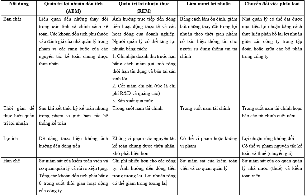 Bảng 2: Các hình thức quản trị lợi nhuận