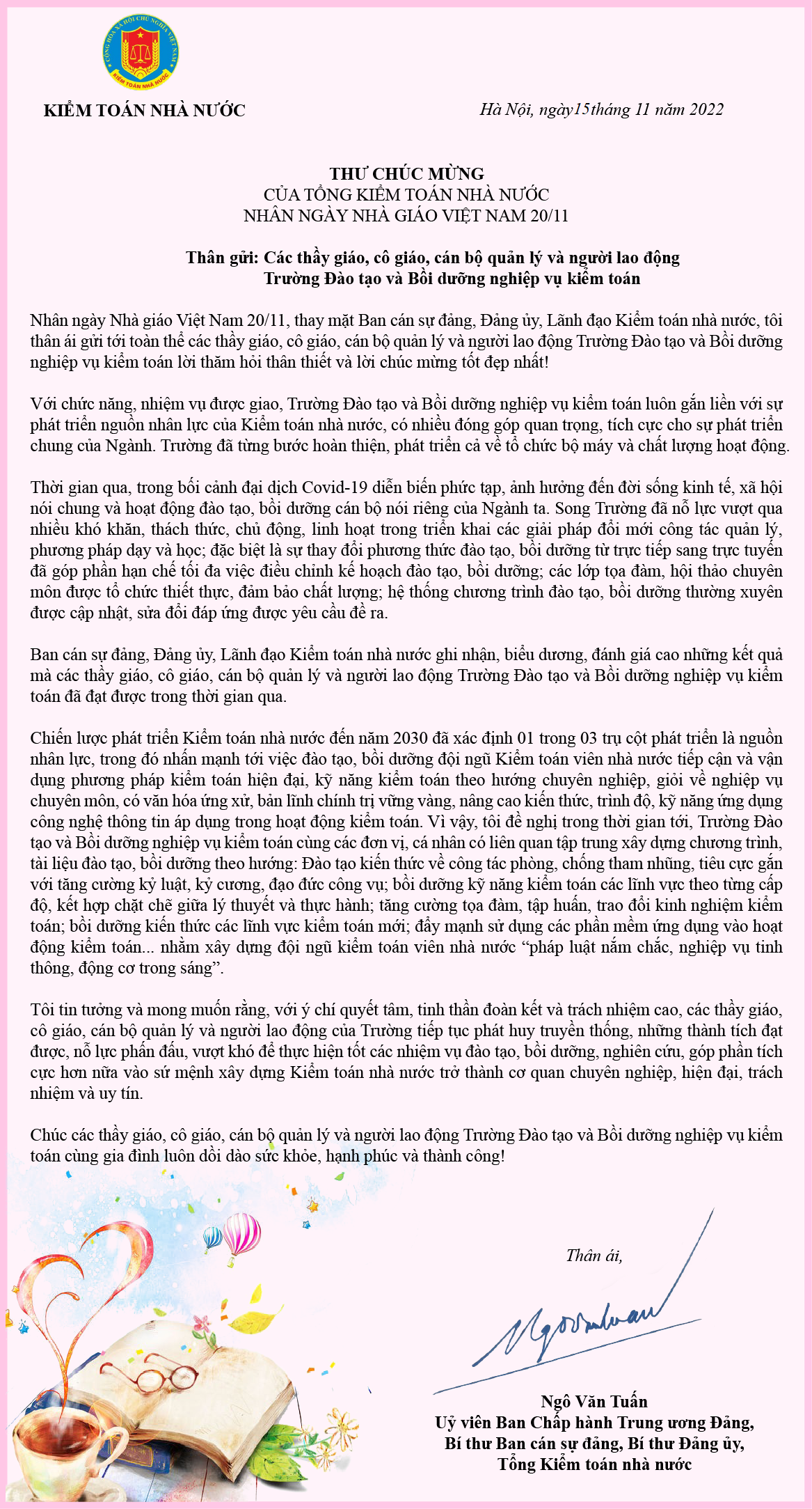 TỔNG KIỂM TOÁN NHÀ NƯỚC NGÔ VĂN TUẤN GỬI THƯ CHÚC MỪNG NHÂN NGÀY NHÀ GIÁO VIỆT NAM 20/11