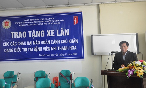 Phát biểu tại buổi lễ, ông Lê Đình Thăng Giám đốc Trung tâm KH&BDCB chia sẻ: Món quà  giá trị tuy không lớn nhưng thể hiện tình cảm và sự quan tâm của Công đoàn KTNN, Viện Kế toán Công chứng Vương quốc Anh và xứ Wales, cán bộ, viên chức và người lao động của Trung tâm KH&BDCB nhằm chia sẻ một phần khó khăn cùng các cháu bị bệnh hiểm nghèo đang được điều trị tại đây, hành động này đã thể hiện tinh thần “tương \thân tương ái”,” lá lành đùm lá rách” một đạo lý cao đẹp của dân tộc Việt Nam.