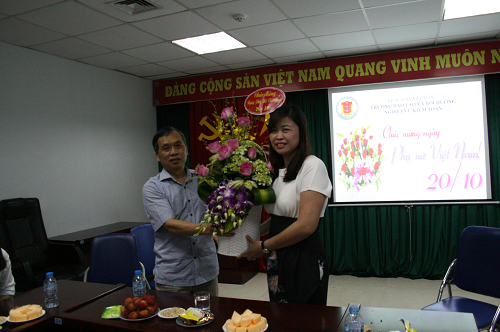 Thay mặt cho chị em nữ công của Trường, Bà Nguyễn Thị Kim Lan - Trưởng ban nữ công đã nhận bó hoa tươi thắm được trao bởi Phó Giám đốc Trường Nguyễn Đình Hòa và cảm ơn sự quan tâm sâu sắc của lãnh đạo và cấp ủy nhà Trường đã quan tâm đến chị em nhân ngày 20/10 và xin hứa sẽ cùng toàn thể viên chức nữ của Trường nỗ lực vươn lên thực hiện tốt các nhiệm vụ được Lãnh đạo Trường giao phó và tạo sự đoàn kết giữa các chi em nữ công của Trường.