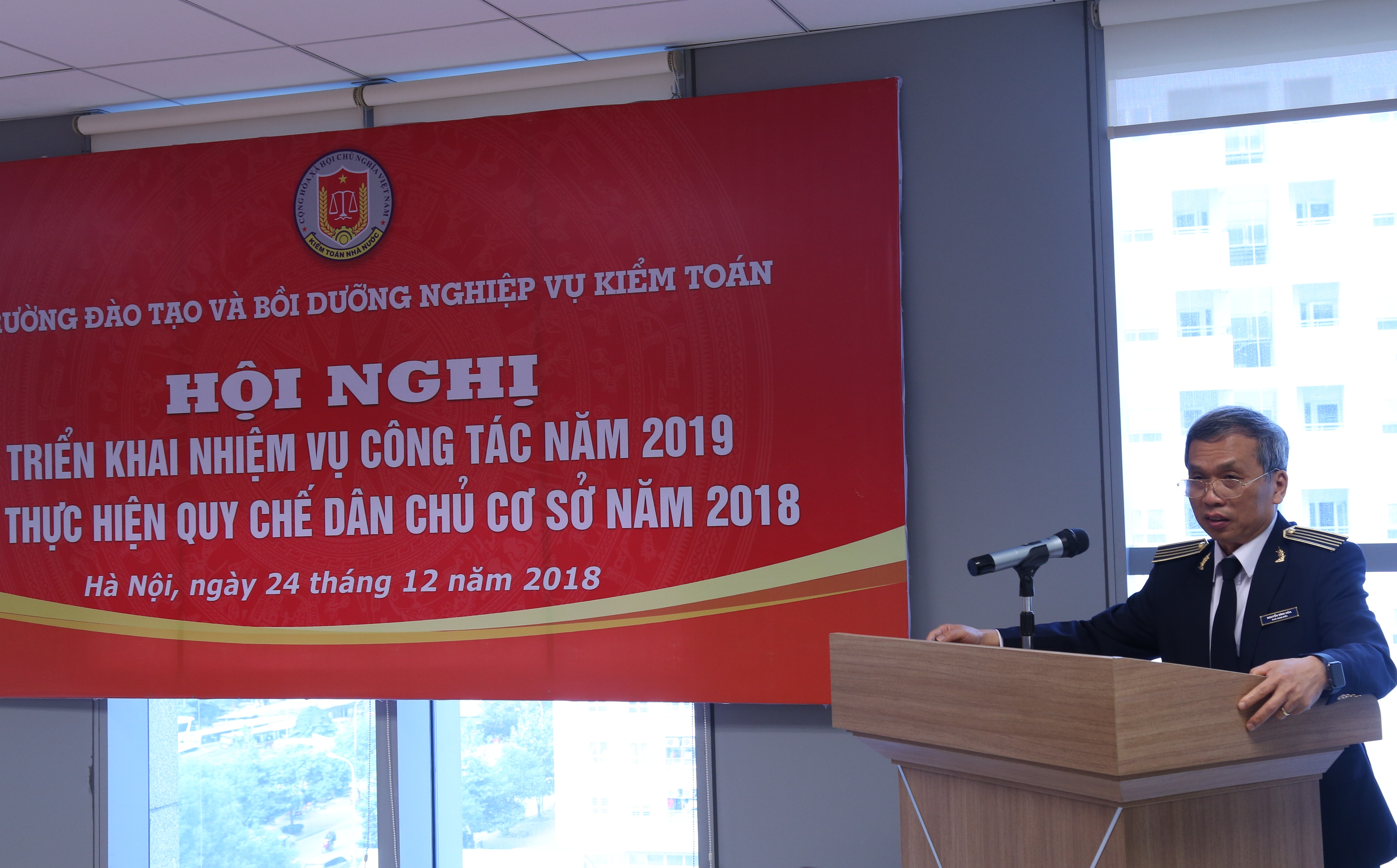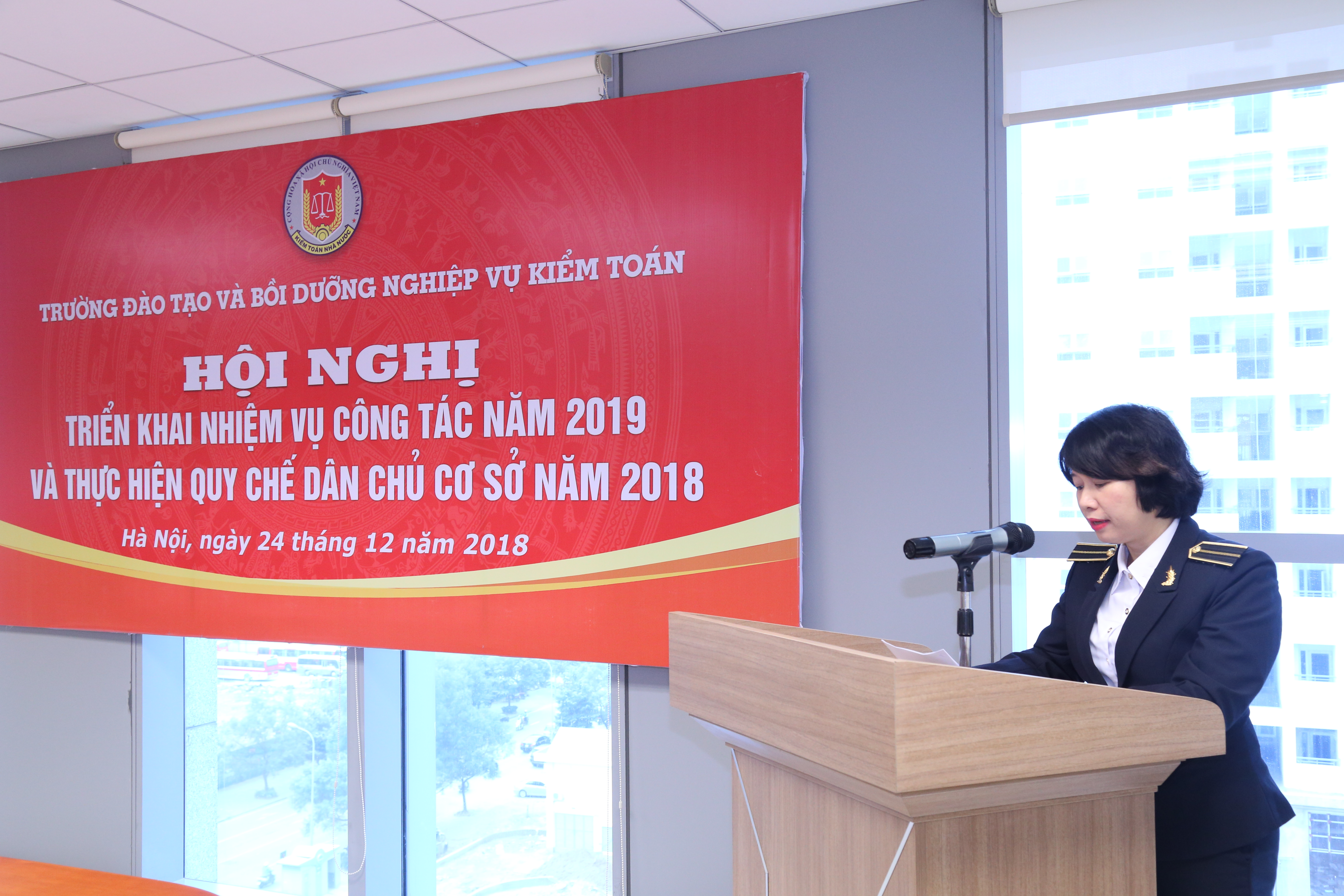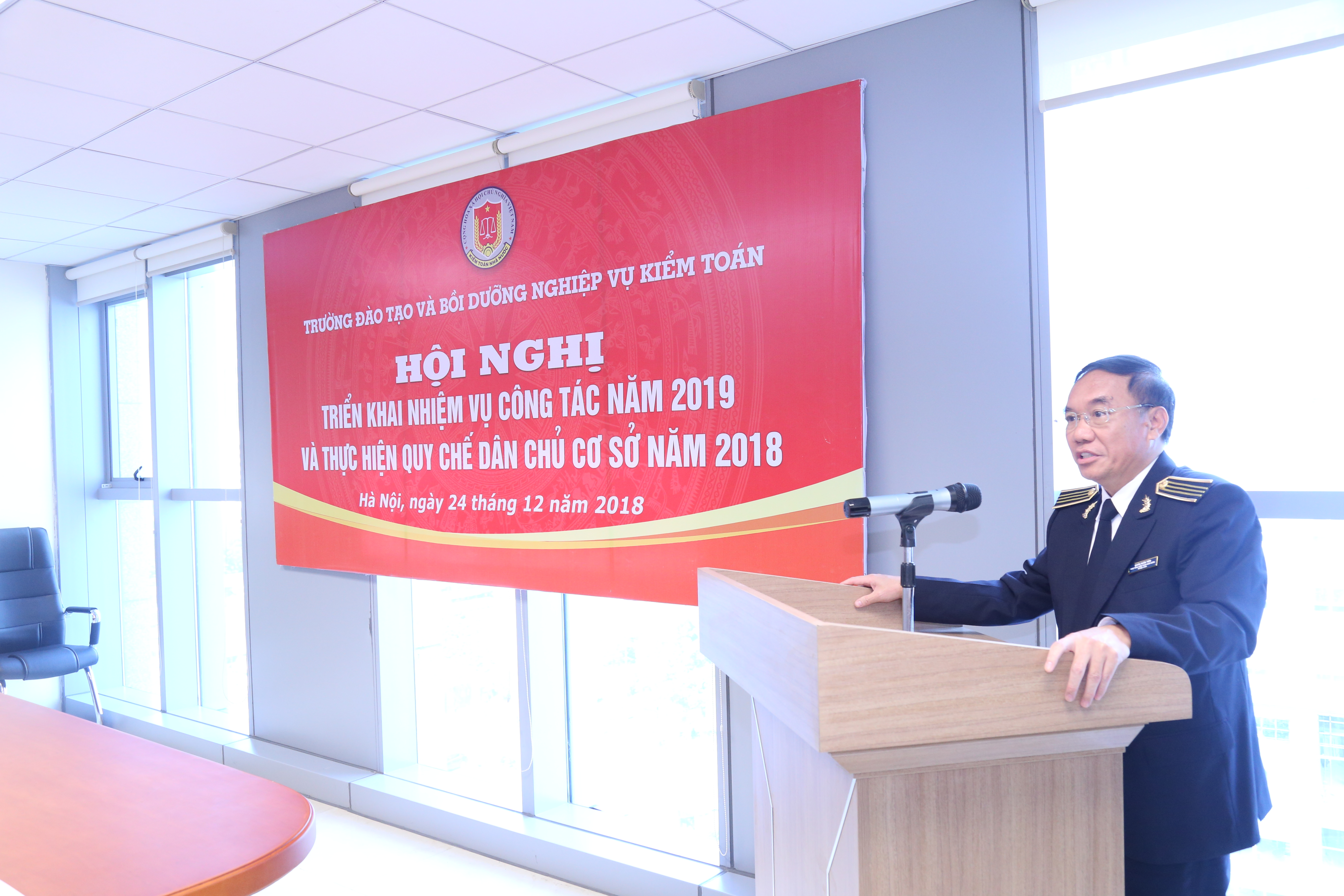 (khoahockiemtoan.vn) - Ngày 24/12/2018, tại Kiểm toán Nhà nước, số 116 Nguyễn Chánh, Thành phố Hà Nội, Trường ĐT&BD nghiệp vụ kiểm toán (Trường) đã tổ chức triển khai công tác năm 2019 và thực hiện quy chế dân chủ cơ sở năm 2018. Đến dự và chỉ đạo buổi Tổng kết có GS.TS Đoàn Xuân Tiên - Phó Tổng KTNN, đại diện lãnh đạo Vụ Tổ chức Cán bộ, Văn phòng KTNN, KTNN một số chuyên ngành….và toàn thể cán bộ, viên chức của Trường.