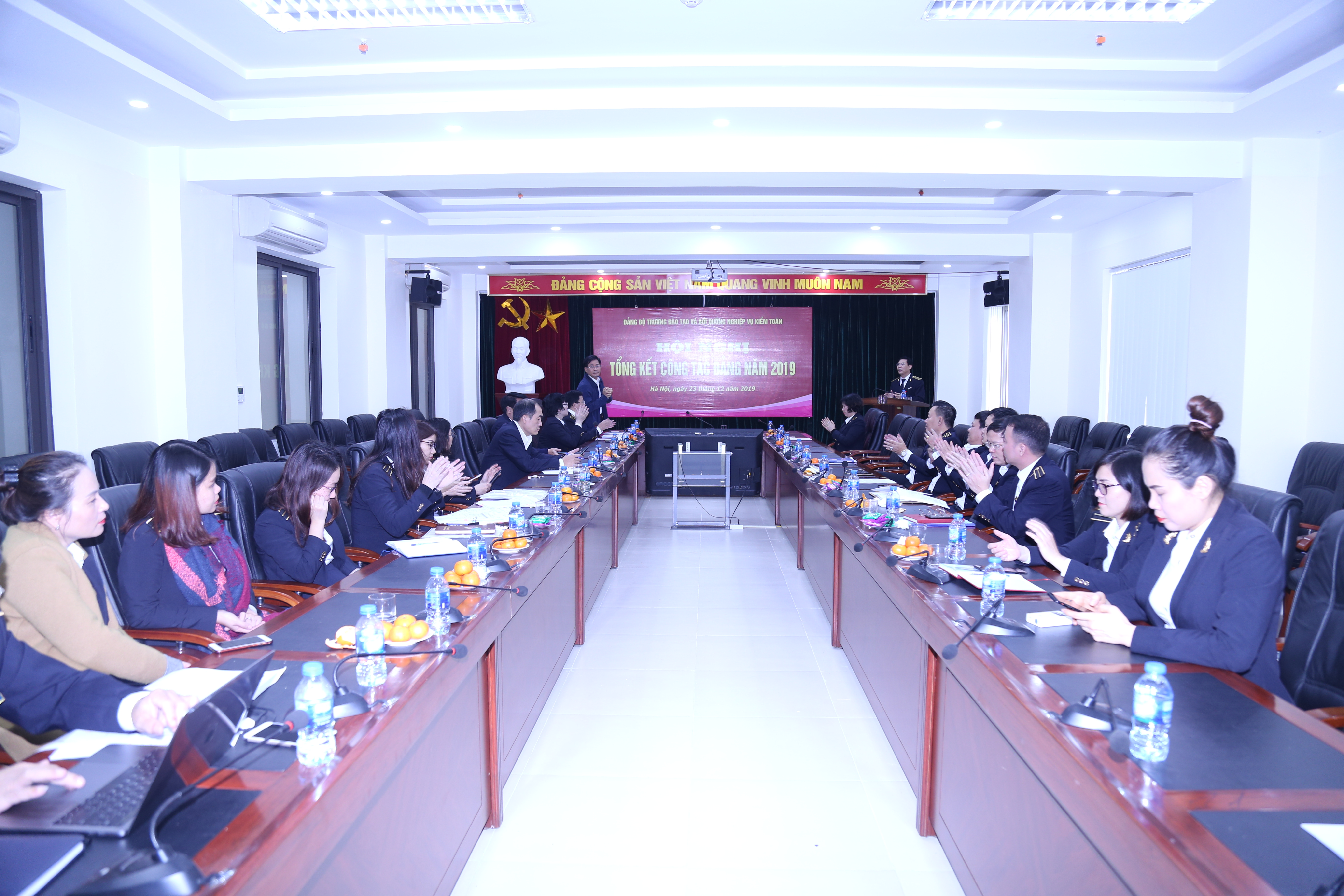 Toản cảnh Hội nghị Năm 2019, ngoài việc chỉ đạo Trường hoàn thành tốt nhiệm vụ chuyên môn, Đảng bộ Trường đã thực hiện tốt công tác giáo dục chính trị đến các đảng viên trong Đảng bộ như: tích cực phổ biến và tổ chức triển khai thực hiện tới toàn đảng viên những văn bản nghị quyêt: Chỉ thị 800-CT/BTV ngày 18/01/2019 của Ban Thường vụ Đảng ủy KTNN về “Lãnh đạo thực hiện thắng lợi nhiệm vụ chính trị trọng tâm năm 2019”; Hướng dẫn số 840-HD/ĐU ngày 01/3/2019 của Đảng ủy Kiểm toán nhà nước triển khai thực hiện Chuyên đề năm 2019 “Xây dựng ý thức tôn trọng Nhân dân, phát huy dân chủ, chăm lo đời sống Nhân dân theo tư tưởng, đạo đức, phong cách Hồ Chí Minh”; Qui định 11-QĐ/TW ngày 18/02/2019 về trách nhiệm của người đứng đầu cấp ủy trong việc tiếp dân; tổ chức quán triệt cho đảng viên nắm bắt chương trình hành động và tham học tập các nghị quyết của Ban CHTW Đảng khóa XII (Nghị quyết hội nghị TW 8. TW10, TW 11) do Đảng ủy KTNN tổ chức;