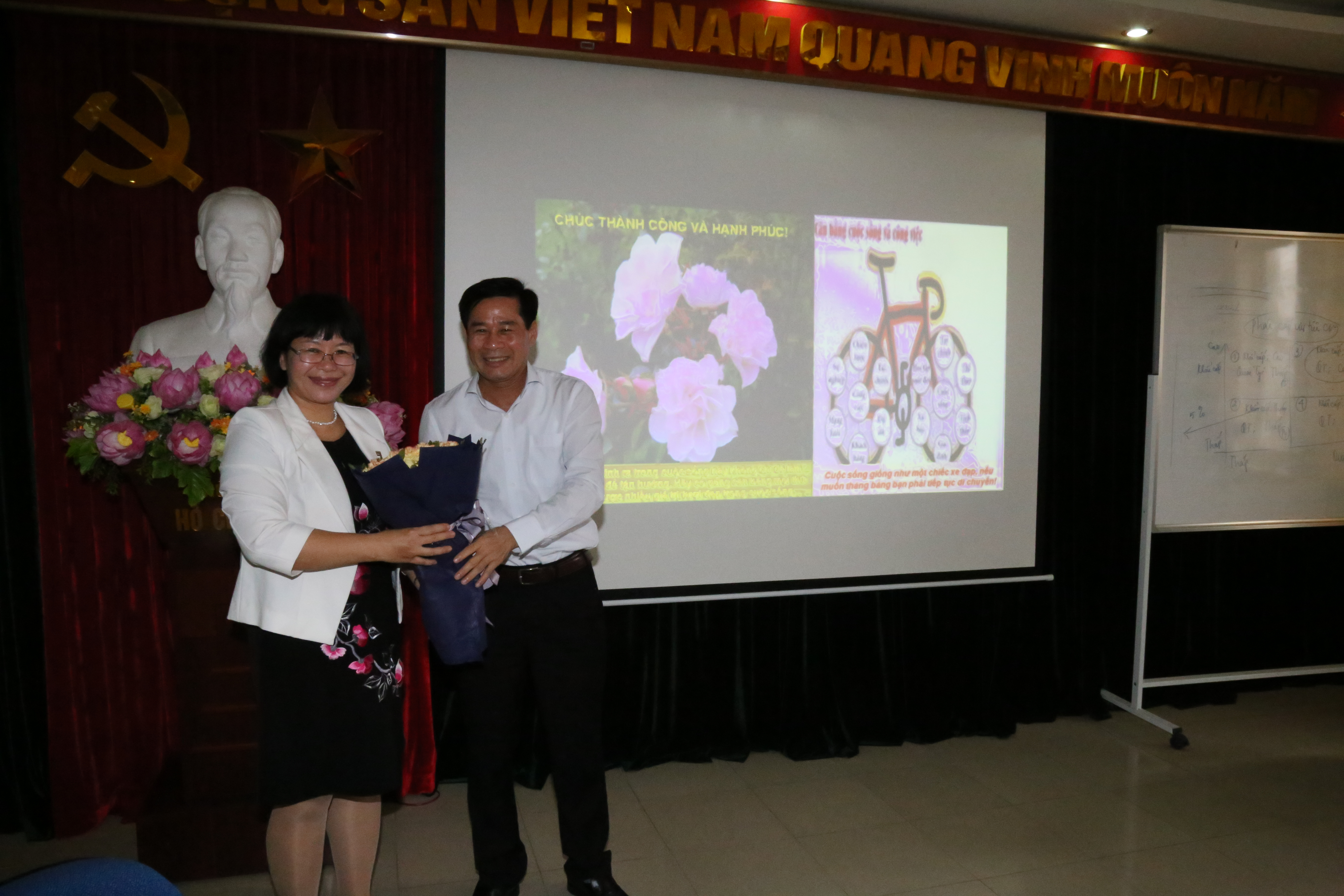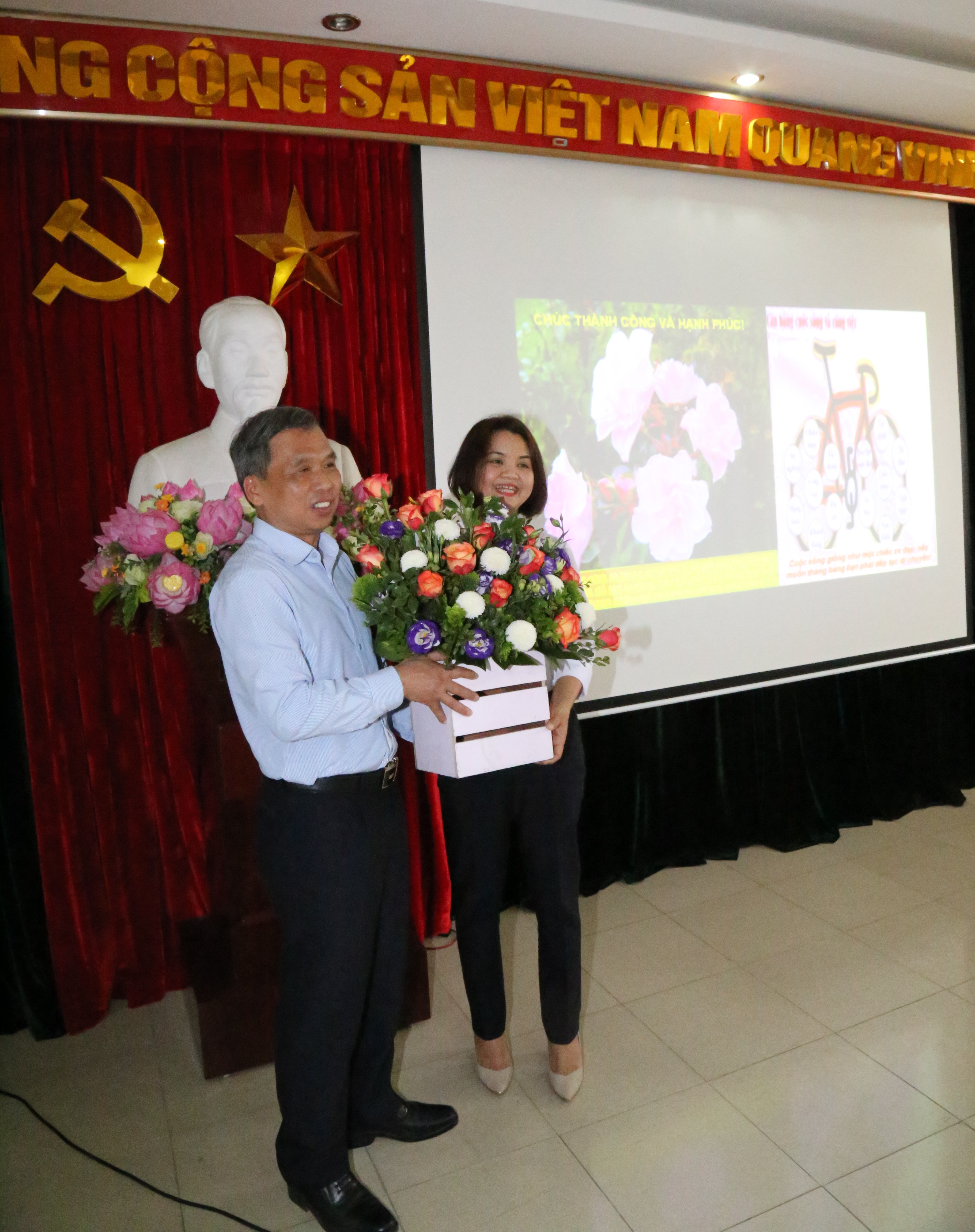 Sau buổi nói chuyện chuyên đề và trao đổi các nội dung liên quan, TS Lê Đình Thăng - Giám đốc Trường đã tặng hoa cho TS. Dương Kim Anh và chị em phụ nữ của Trường nhân ngày quốc tế 8/3.