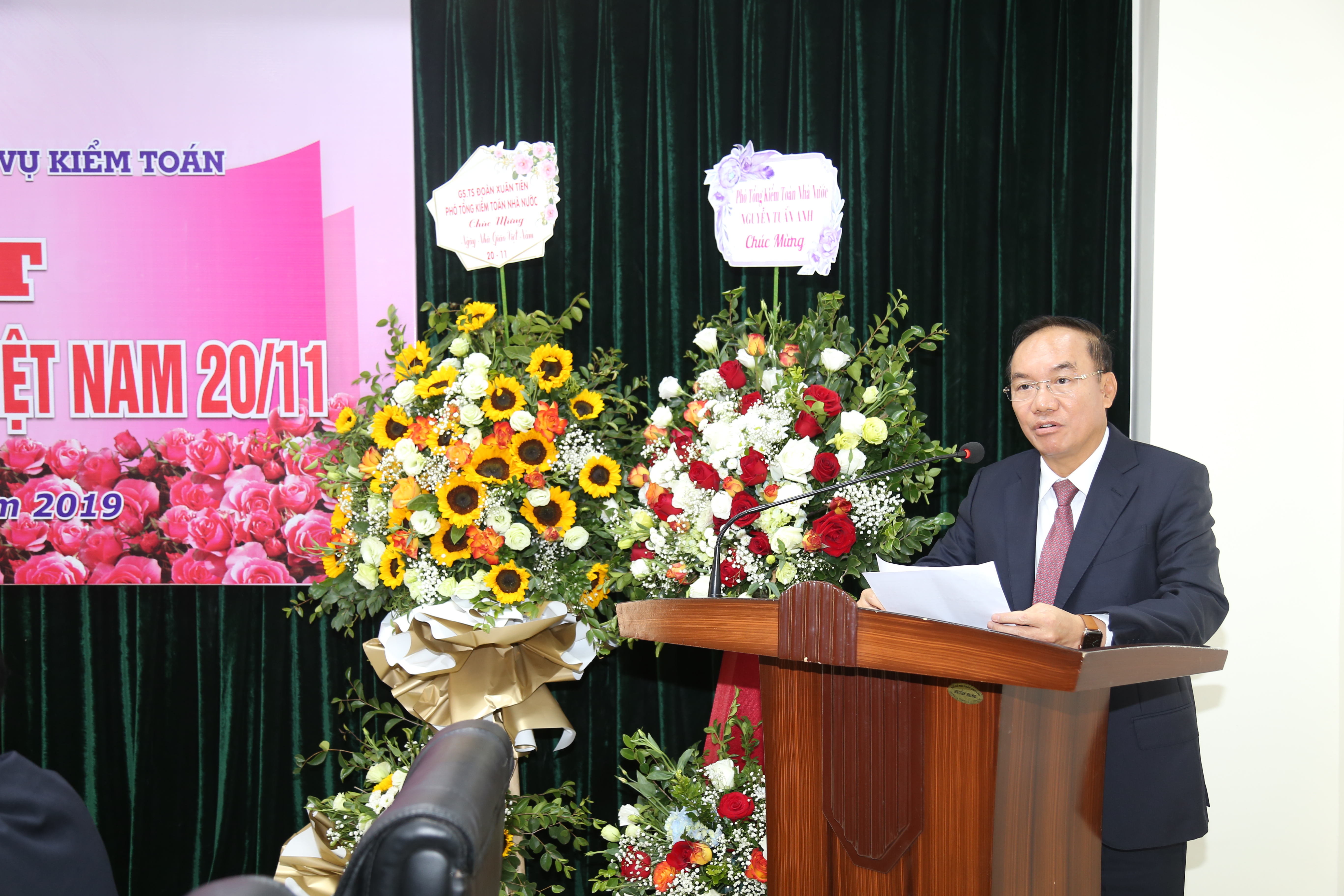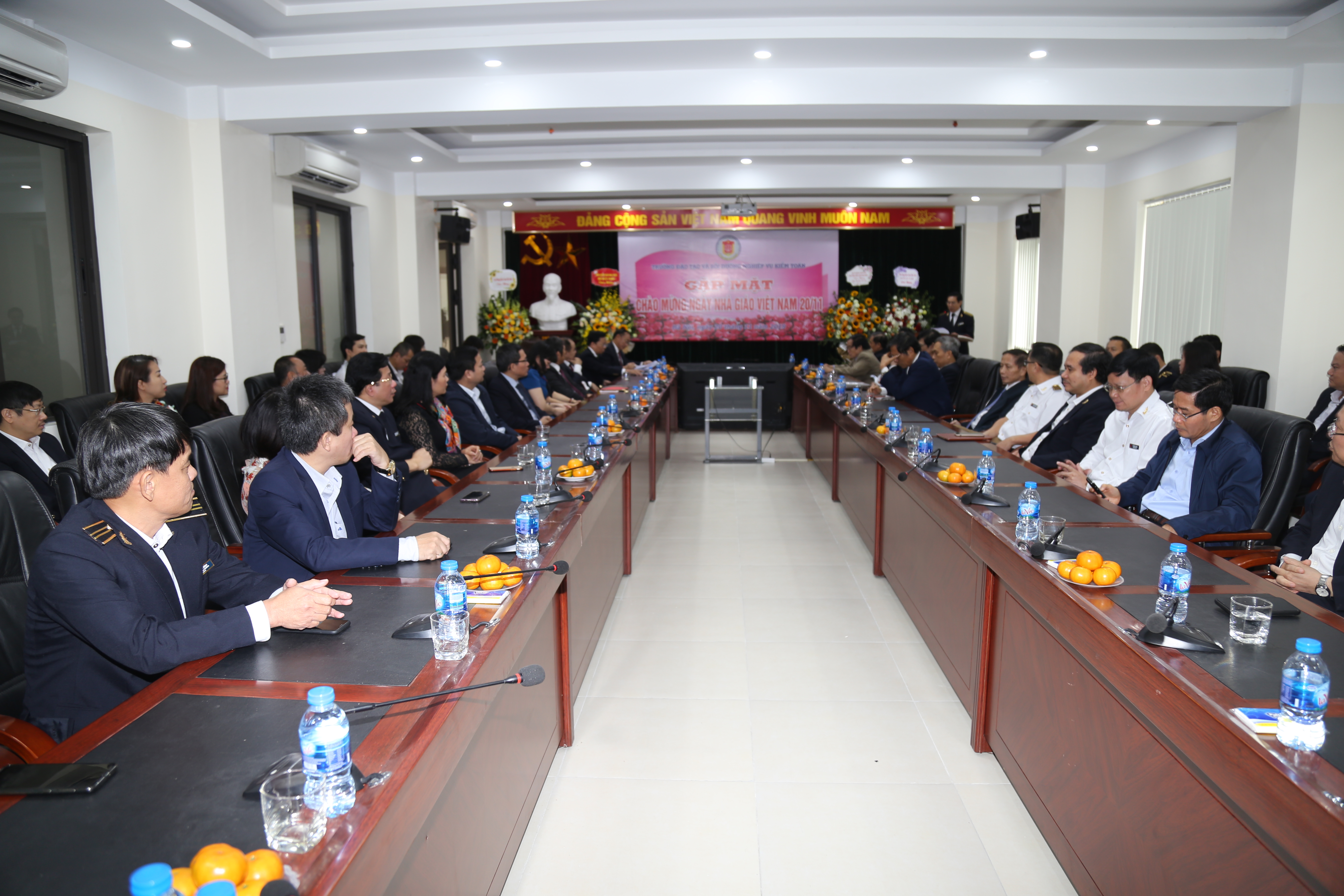 (khoahockiemtoan.vn) - Sáng ngày, 20/11/2019, Trường ĐT&BD nghiệp vụ kiểm toán tổ chức kỷ niệm Ngày nhà giáo Việt Nam 20/11. Đến dự buổi Lễ có GS.TS Đoàn Xuân Tiên, TS.Vũ Văn Họa Phó Tổng KTNN, PGS.TS Đặng Văn Thanh, các đồng chí nguyên là Giám đốc, Phó Giám đốc Trường đã nghỉ hưu, lãnh đạo các đơn vị trực thuộc KTNN, các giảng viên kiêm chức và toàn thể viên chức và người lao động của Trường. Tổng KTNN Hồ Đức Phớc, các Phó Tổng KTNN Nguyễn Quang Thành, Nguyễn Tuấn Anh, Đặng Thế Vinh đã gửi lẵng hoa chúc mừng.